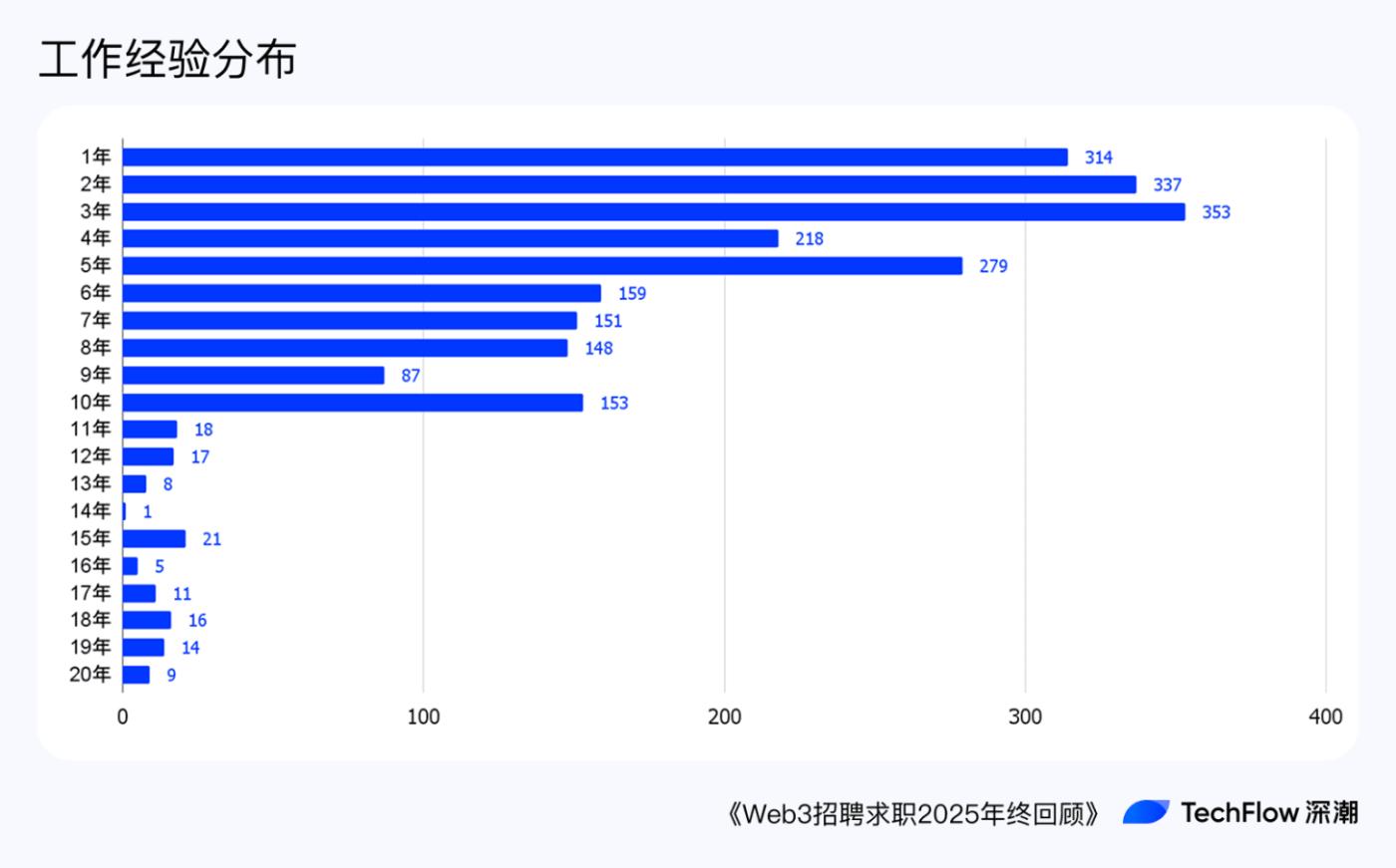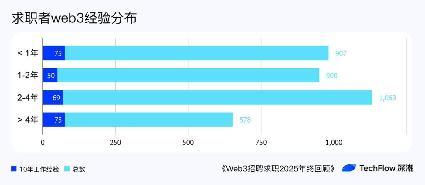 工作经验 10 年+ 的人中,大部分也对 Web3 了解尚浅,可能存在转行困难,因大部分 Web3 公司都非常看重求职者的加密原生经验。