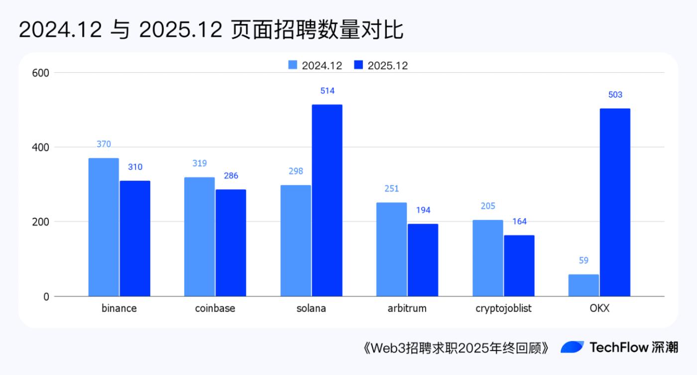 在和 2024 年 12 月的对比上,Solana 招聘页面出现了明显的上涨(298 → 514,+72.5%),其他平台除了 OKX 则出现了不同程度的萎缩。但也有可能是因为 OKX 去年并未重用官方招聘页面。