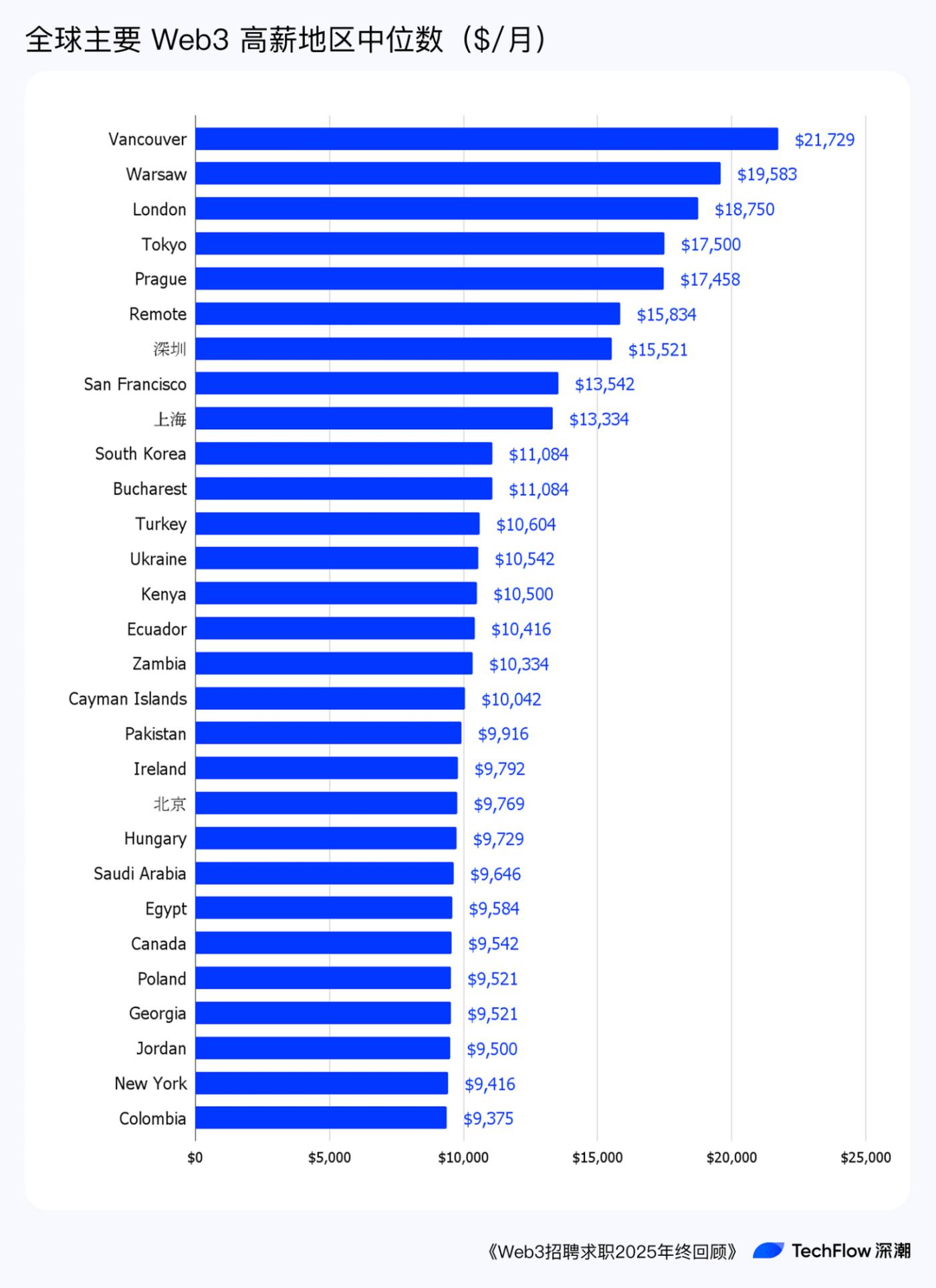 按薪资分布排名,除常见欧美城市外,两个欧洲城市华沙和布拉格、两个亚洲城市上海和深圳意外进入 Web3 前 10 高薪地区(见下图)。