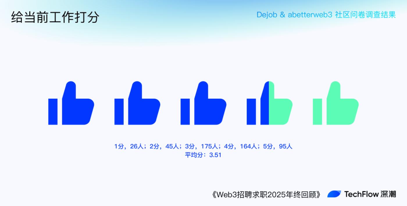综合加班不多、可以远程、可以兼职等因素,不少人对自己当前的工作打出了认可的评价。在给当前工作评分一栏,大家的平均分是 3.51。