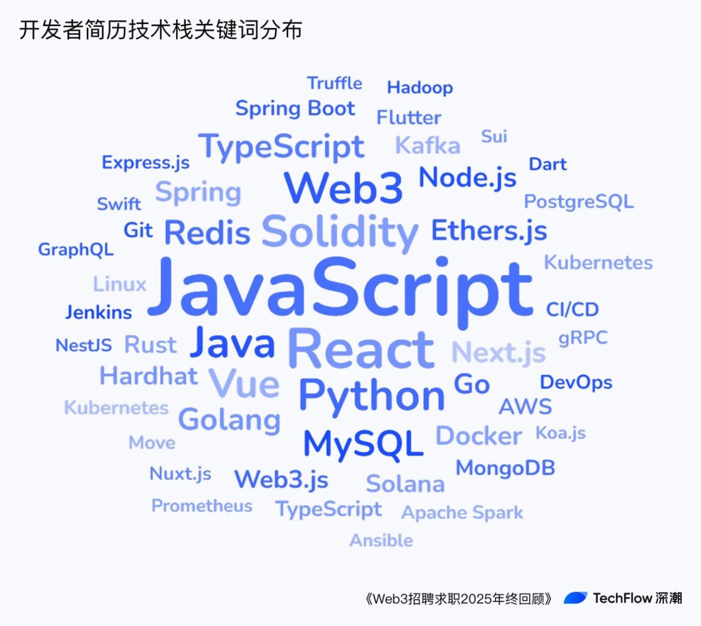 技术栈需求以AI、区块链、后端为主,Solidity、Move 等链上原生语言仍相对小众。
