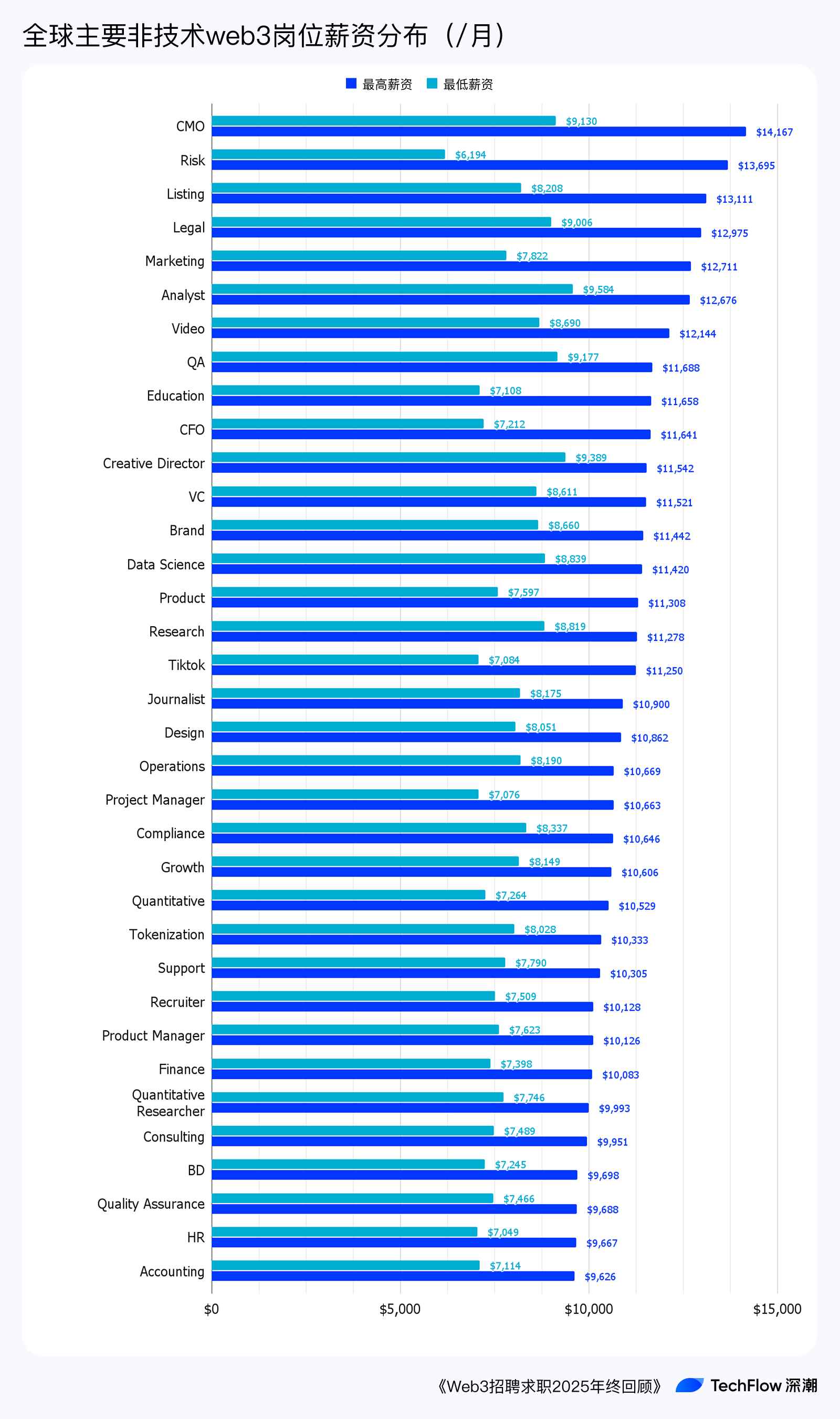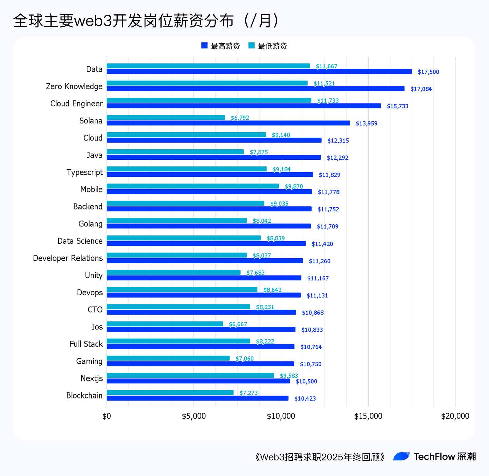 数据和零知识证明相关岗位薪资最高,月薪上限可达 $17,500(约 12.5 万人民币)。这类岗位对数学、密码学、算法有极高要求,人才稀缺导致高薪情有可原。云工程师、Solana 开发等贴合链上技术栈趋势的岗位也排在靠前。