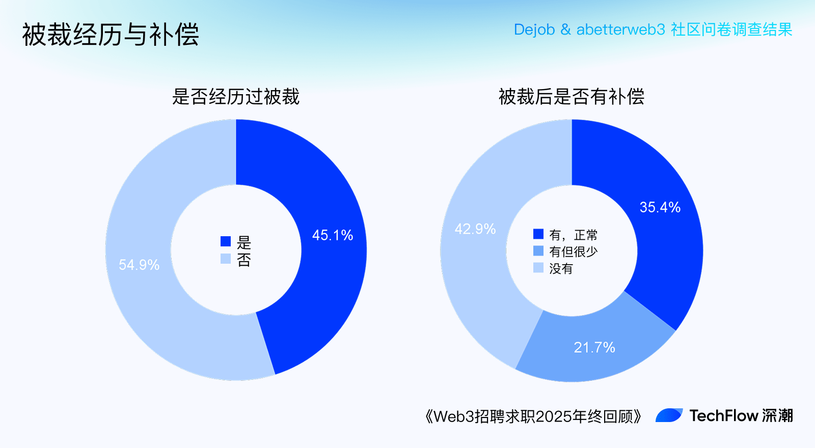 接近的一半的人经历过裁员,且被裁后 40% 的人表示没有补偿,21% 的人表示即便有补偿也远远达不到法律设置的标准(如 n+1)。