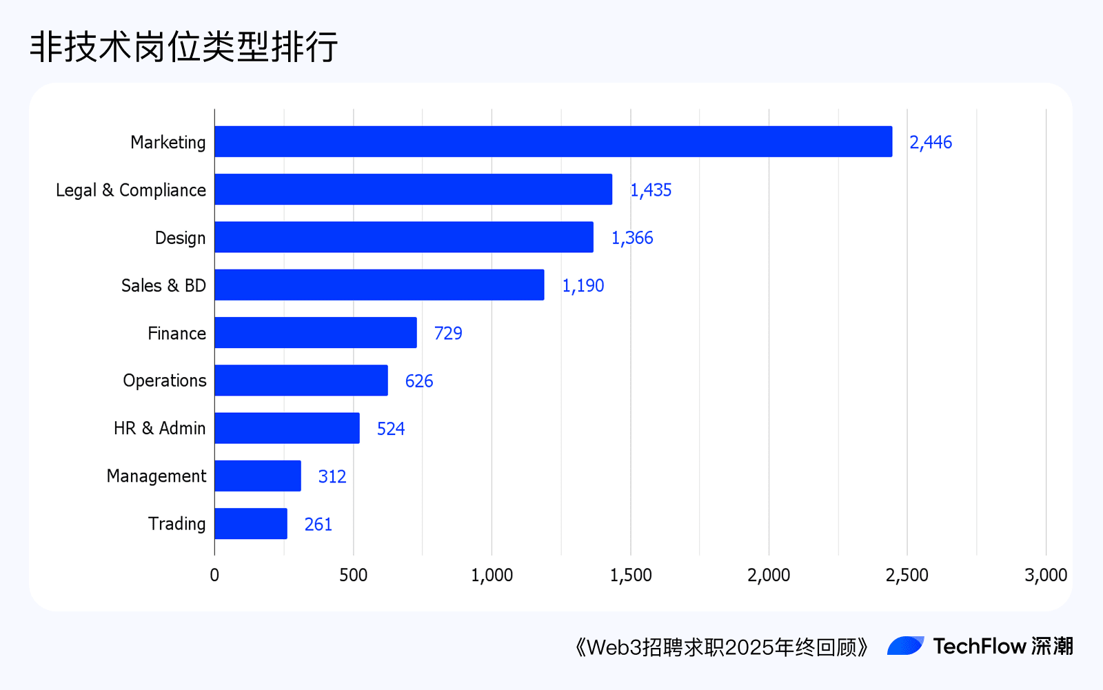 非技术岗位的需求中,法务/合规需求占到了非常大的部分。如前文所言,法务/合规已经是过去的加密企业迈向新篇章不可或缺的一部分。