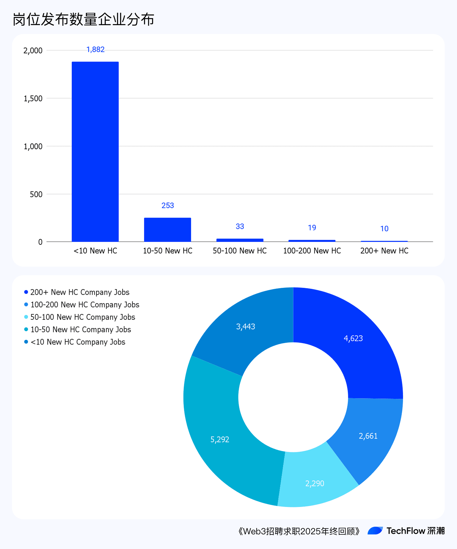 招聘市场马太效应突出,HC 超过 100 个的大型 Web3 公司只有数十家但其岗位数量占到总数的40%。
