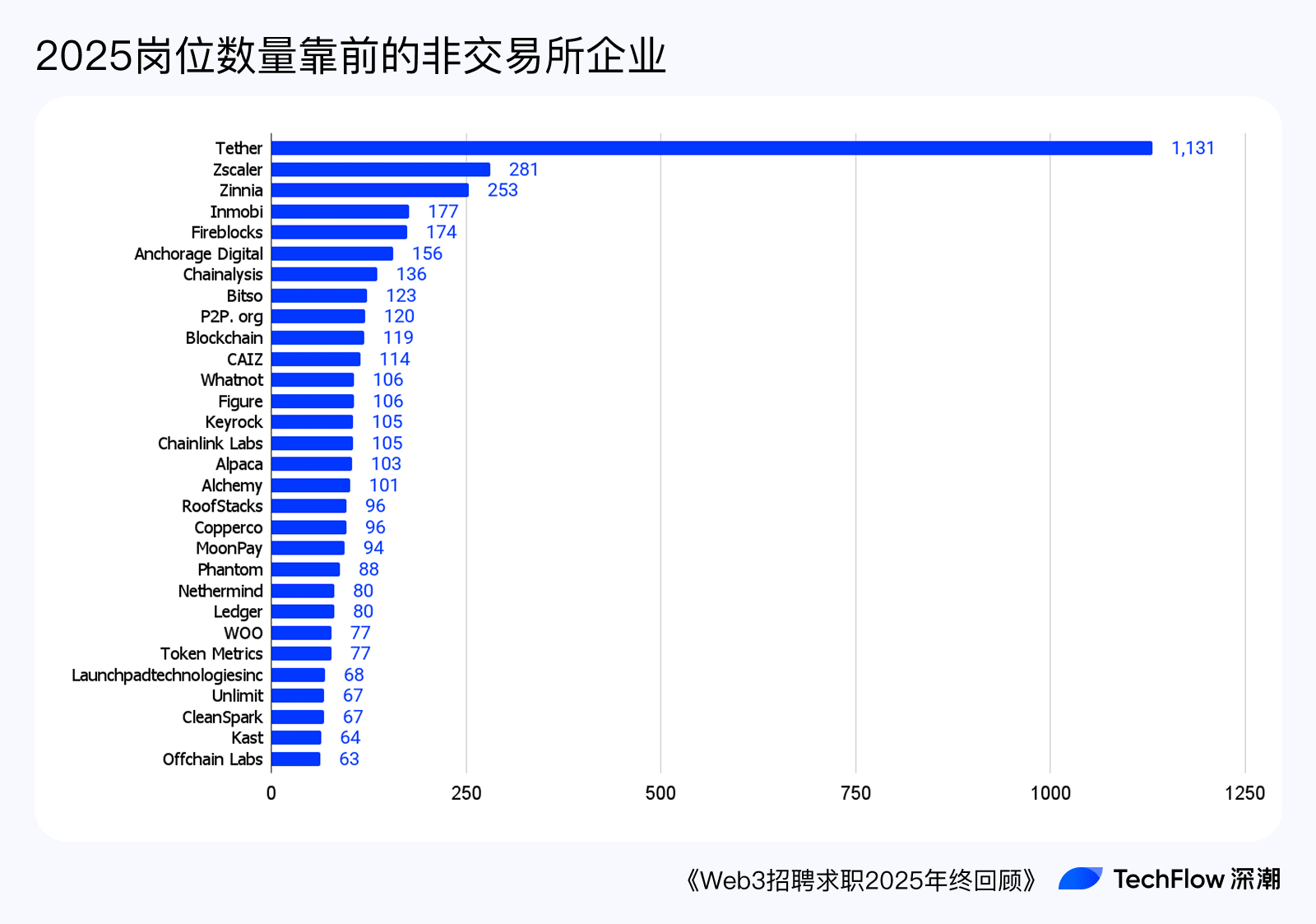 非交易所公司中,Tether 以全年 1,000+ 的 HC 展现了强劲的利润和韧性;但其他类型的企业则显然不如交易所,且高发布量的企业也主要集中在安全、资金托管等已经较为成熟的商业模式中。