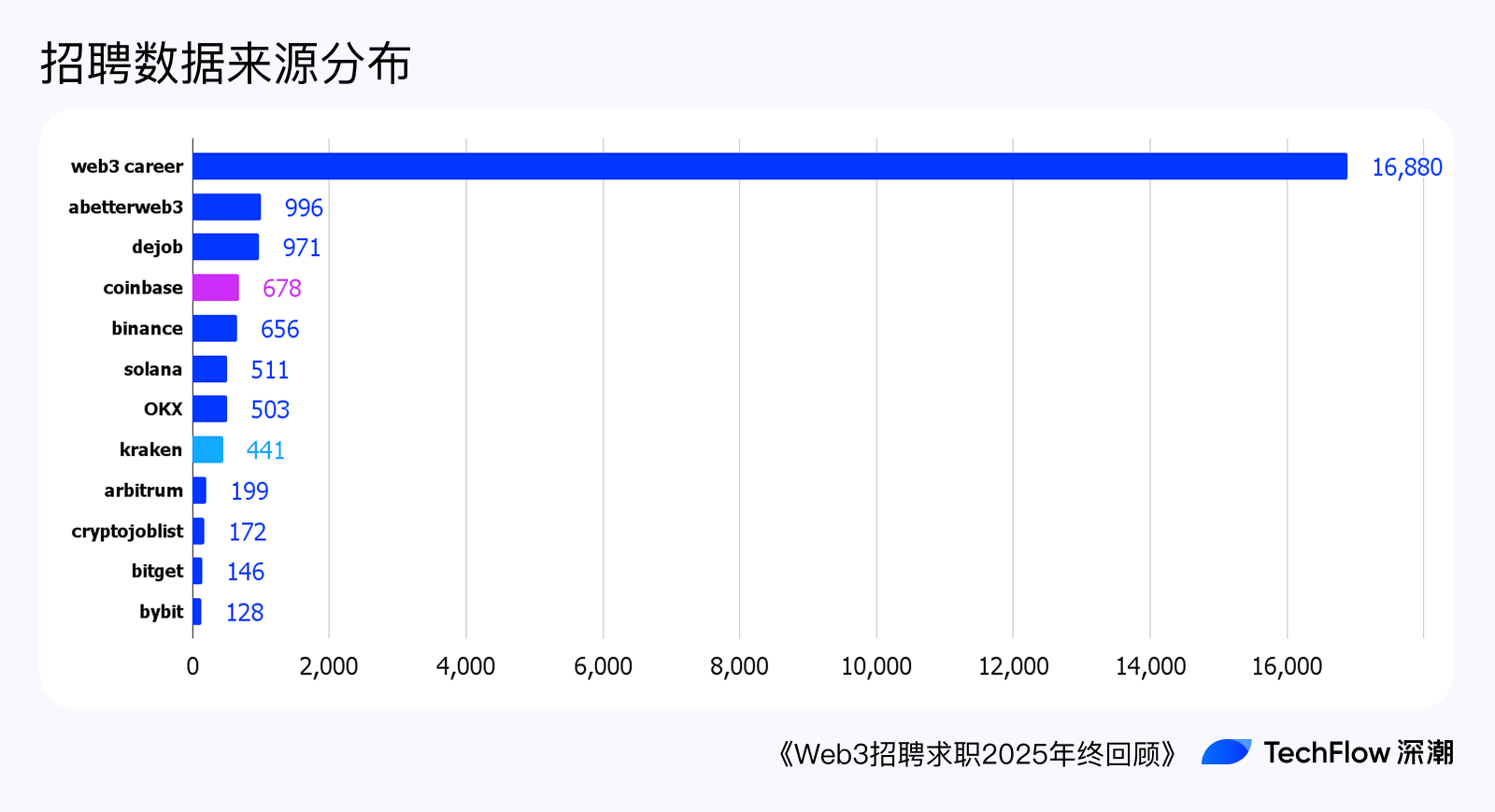 各招聘渠道中,web3.career 因其能快捷筛选远程岗位、岗位多公司多,成为许多招聘方和求职者的首选,发布量断崖式领先。