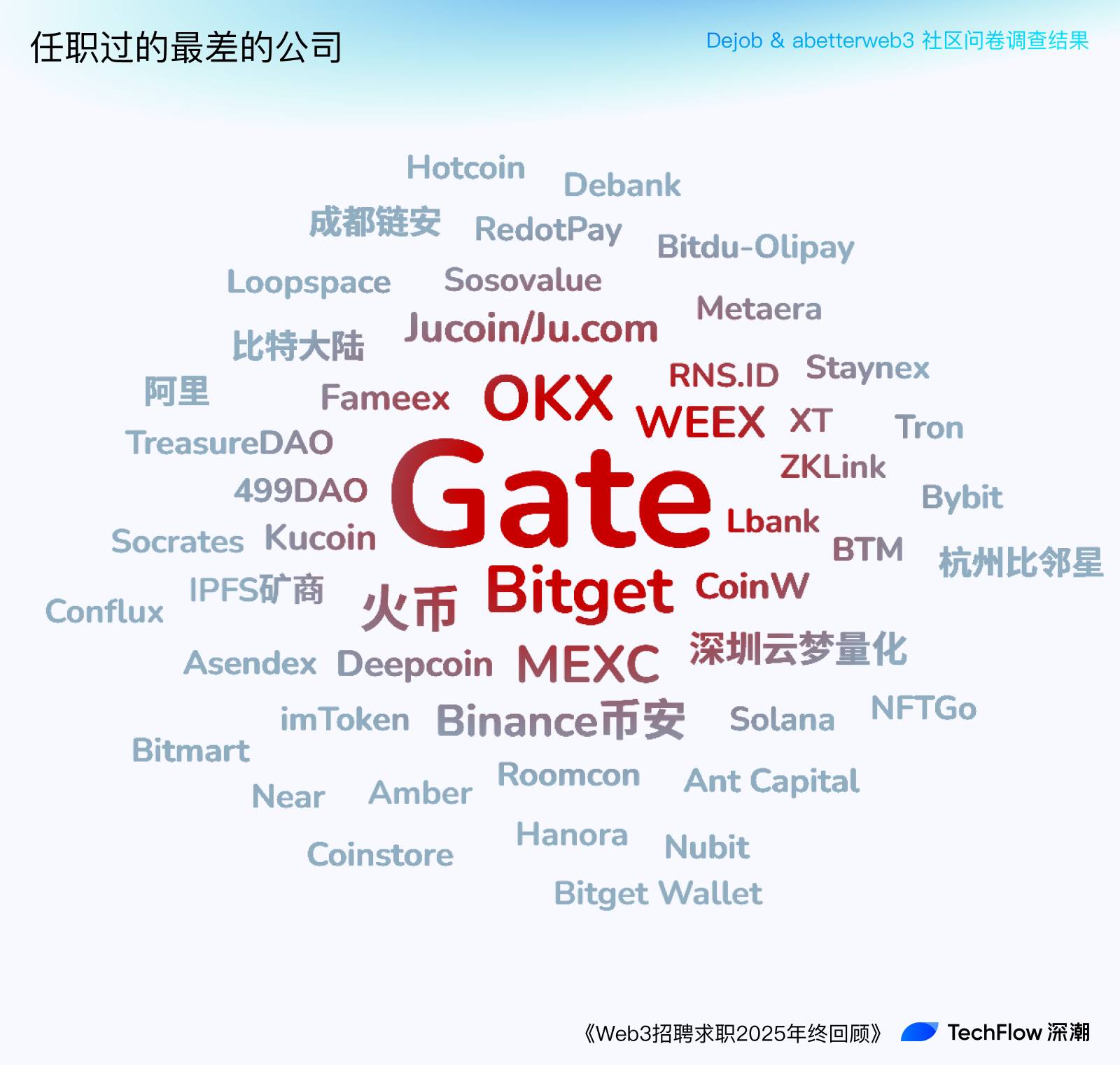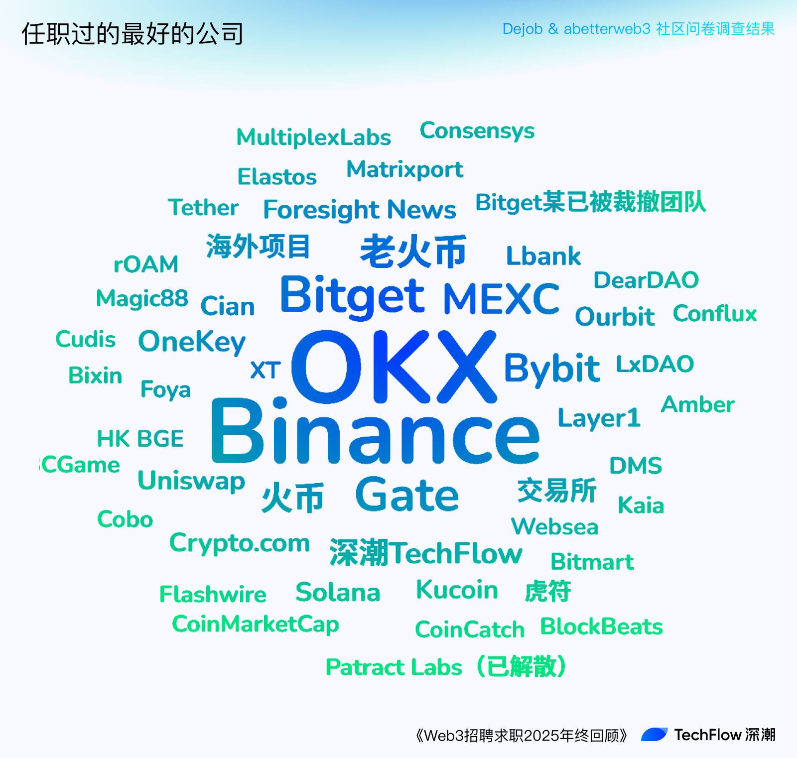 币安作为行业龙头不出意外的被评为榜首。作为“币圈腾讯”,币安既有圈外人的滤镜,也有行业内简历金字招牌的作用,在扶持个人职业生涯上名副其实。链上新贵 Hyperliquid 作为非交易所企业入围前 10,某种意义上反映了其社区的强壮和人们对非交易所产品的渴望。除头部交易所外,这个答案里外企/海外 infra 的名字显著增加,也某种意义上反映了大部分求职者对外企的滤镜和对华人团队的失望。