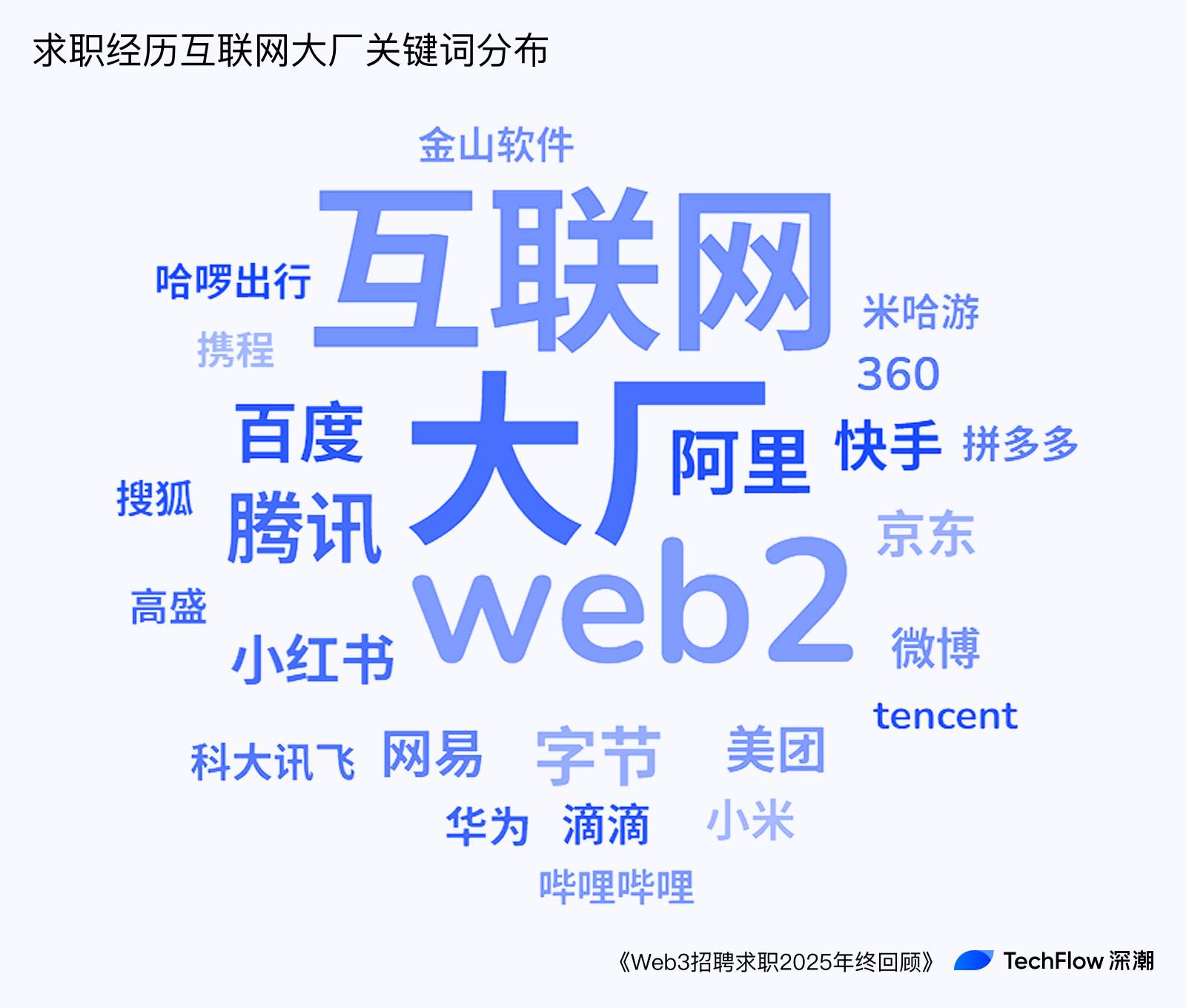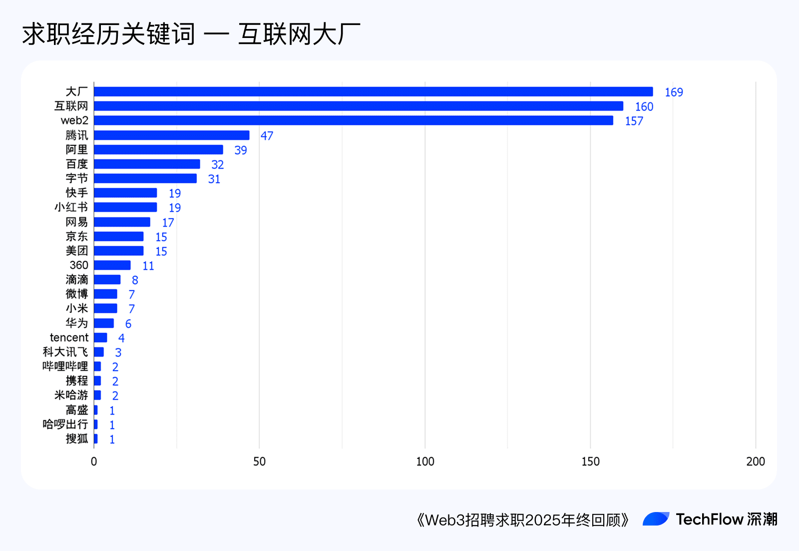 华人求职者背景中大量出现较多 Web2 大厂公司名,10年+经验的人占到总统计数的 10%。
