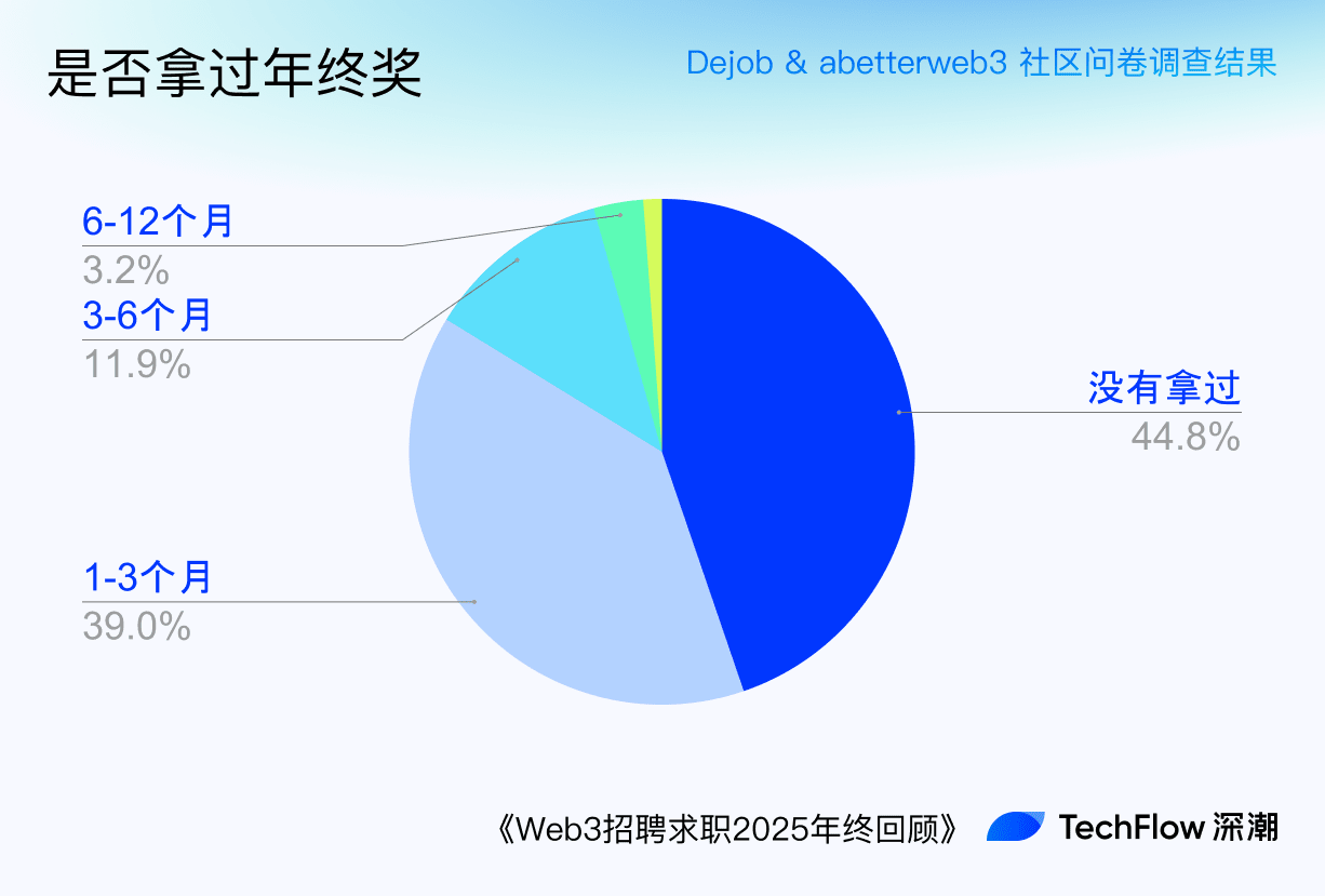 接近一半的人表示没有拿过年终奖;即使有年终奖的人普遍收到的也为 1-3 个月,与 Web3 行业外的绝大多数互联网公司基本持平。