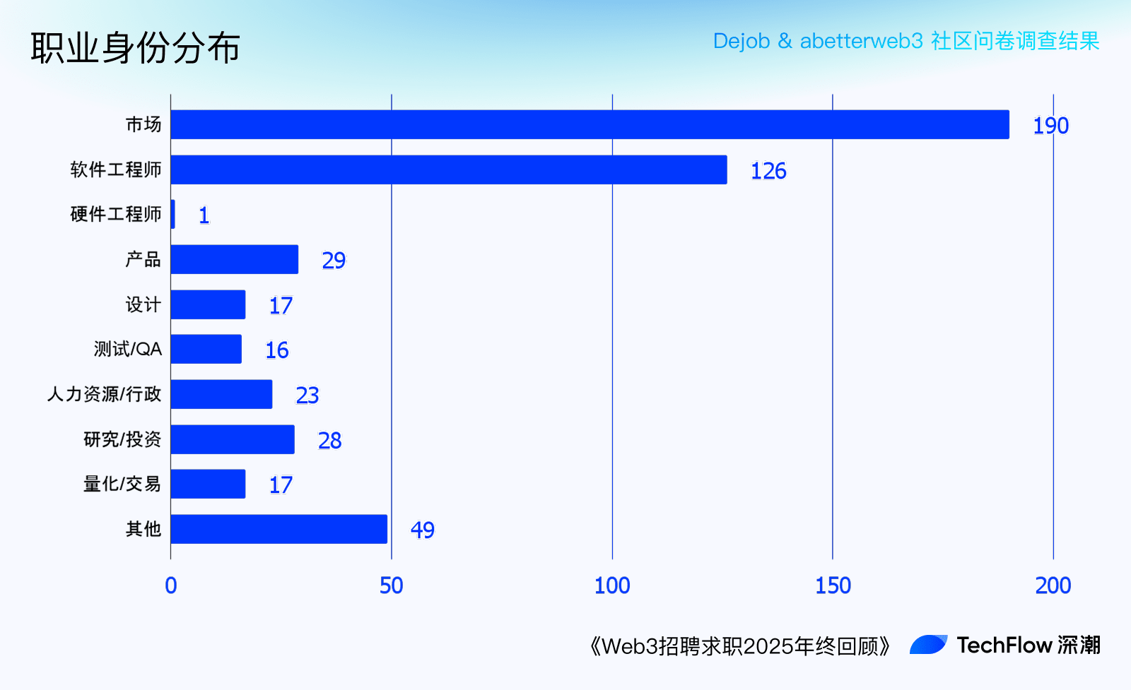 职业身份方面,人数第一多的是市场类角色(运营/BD/客服等),其次是开发者(前后端/智能合约/区块链等)。