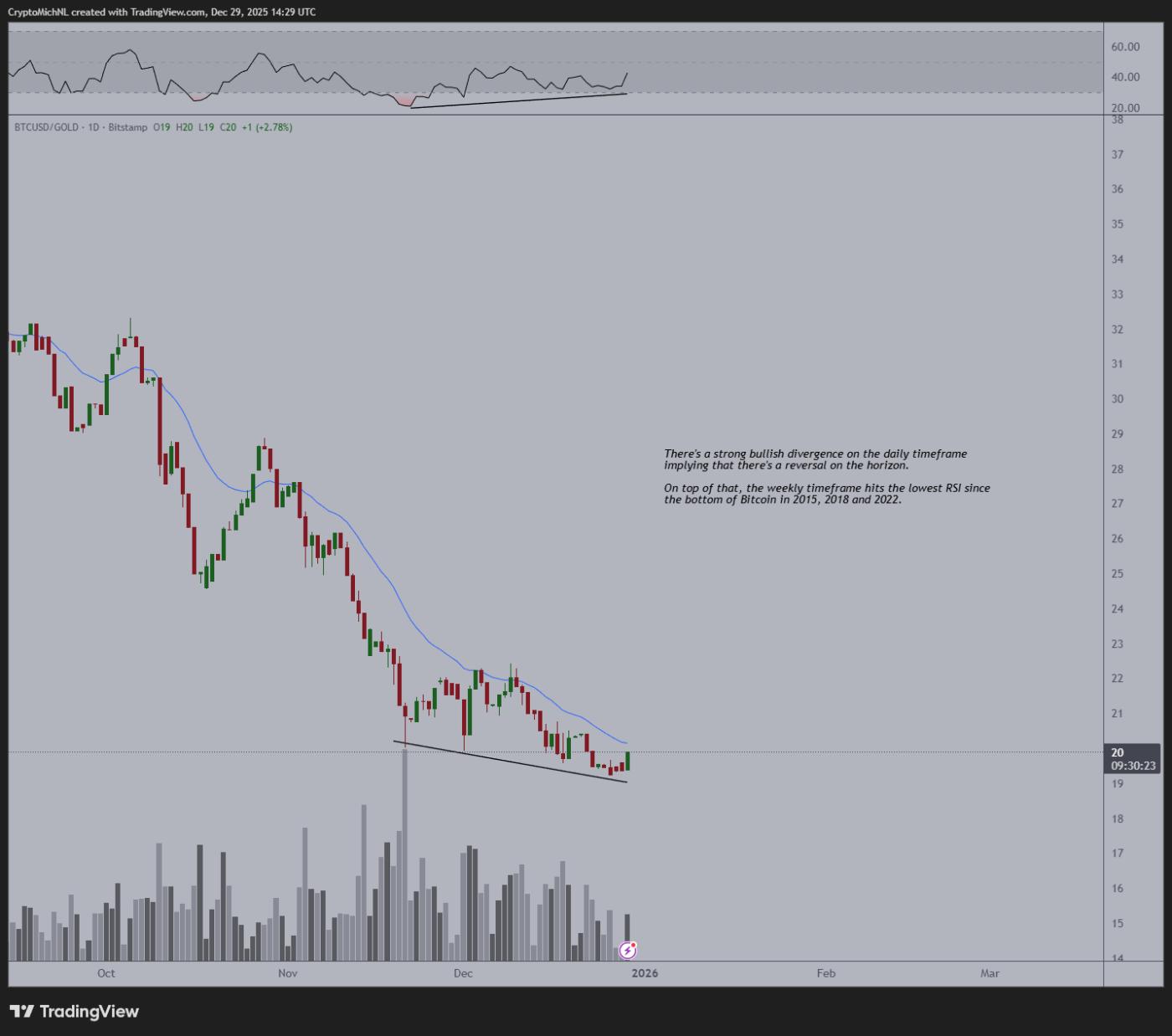 在另一篇文章中,Van de Poppe 观察到BTC/黄金日线图上出现看涨背离,表明比特币在未来一段时间内可能会跑赢黄金。