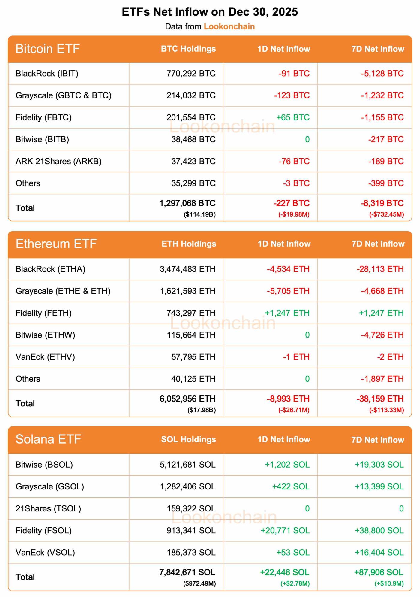 深潮 TechFlow 消息,12 月 30 日,据 Lookonchain 监测,截止于发稿,今日 10 只比特币 ETF 净流出 227 枚 BTC(价值 1998 万美元),9 只以太坊 ETF 净流出 8,993 枚 ETH(价值 2671 万美元),SOL ETF 净流入 22,448 枚 SOL(价值 278 万美元)。