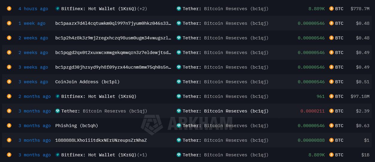 此次购买包括于 2025 年 11 月 7 日从Bitfinex提取 961 个BTC(约合 9718 万美元)。此外,还包括于 2026 年 1 月 1 日向 Tether 的比特币储备地址转移 8888.8 个BTC(价值近 7.78 亿美元)。