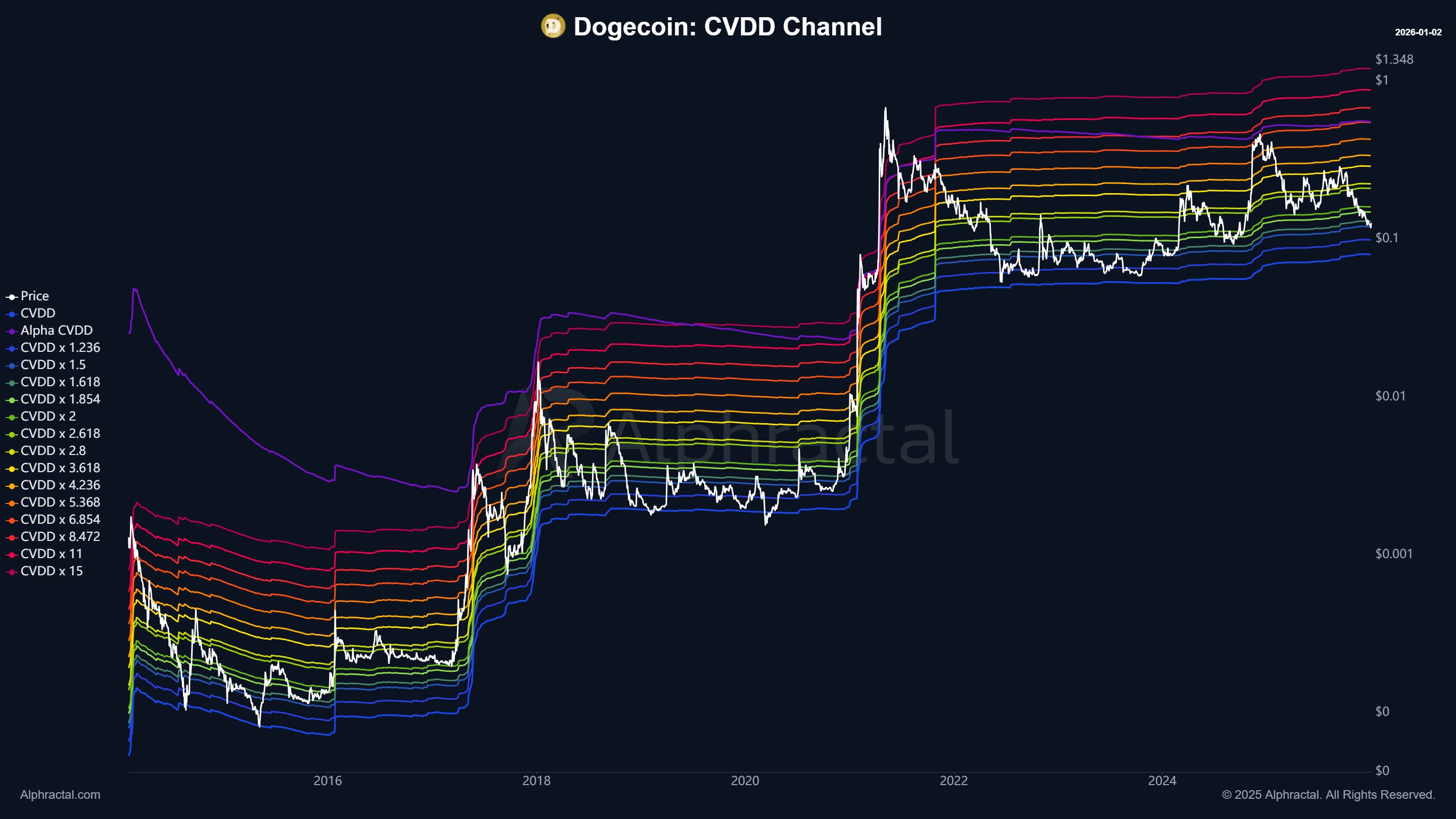 Wedson 在他的文章中强调,CVDD 通道取决于 CVDD 曲线顶部的斐波那契水平线。该指标创建了价格往往会做出反应的历史价值区域;例如,蓝色的 CVDD 线就为Dogecoin的价格提供了强有力的结构性支撑。