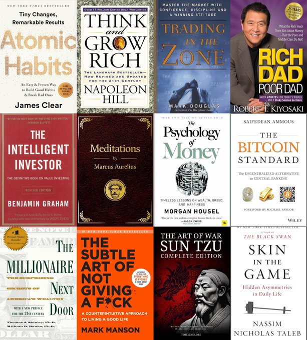 ✨以下十本加密货币爱好者必读书籍,用十个字以内概括: 1) 《原子习惯》(Atomic Habits),作者:詹姆斯·克利尔(James Clear):微小而持续的改变会累积成显著的成果。 2) 《思考致富》(Think and Grow Rich),作者:拿破仑·希尔(Napoleon Hill):渴望和信念可以将思想转化为财富。 3) 《交易入门》(Trading in)