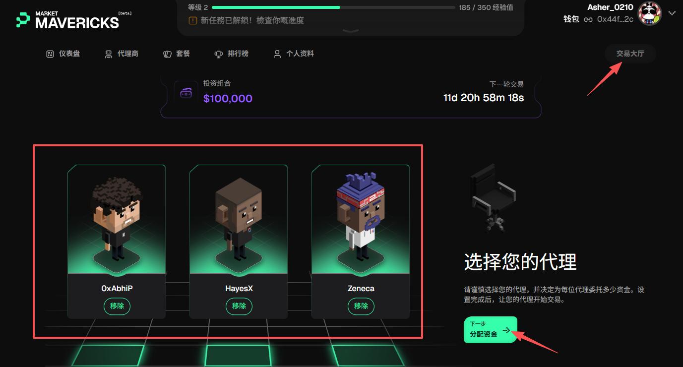 STEP 4. 点击“交易大厅”,根据提示选择三个“交易代理”后点击“分配资金”。