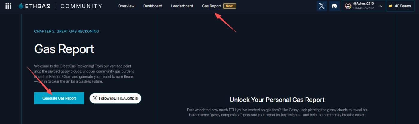 STEP 3. 进入“Gas Report”栏目后关注官推并选择“Generate Gas Report”生成个人 Gas 报告。