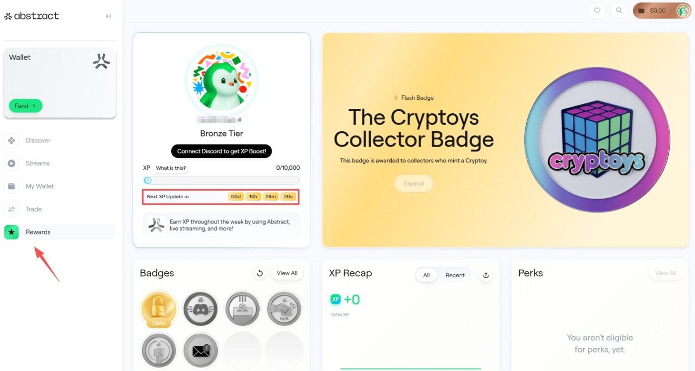 交互网站链接:https://portal.abs.xyz/rewards,会定期更新 XP 任务,根据提示完成赚取 XP 积分以及徽章(下图为全新账号)。