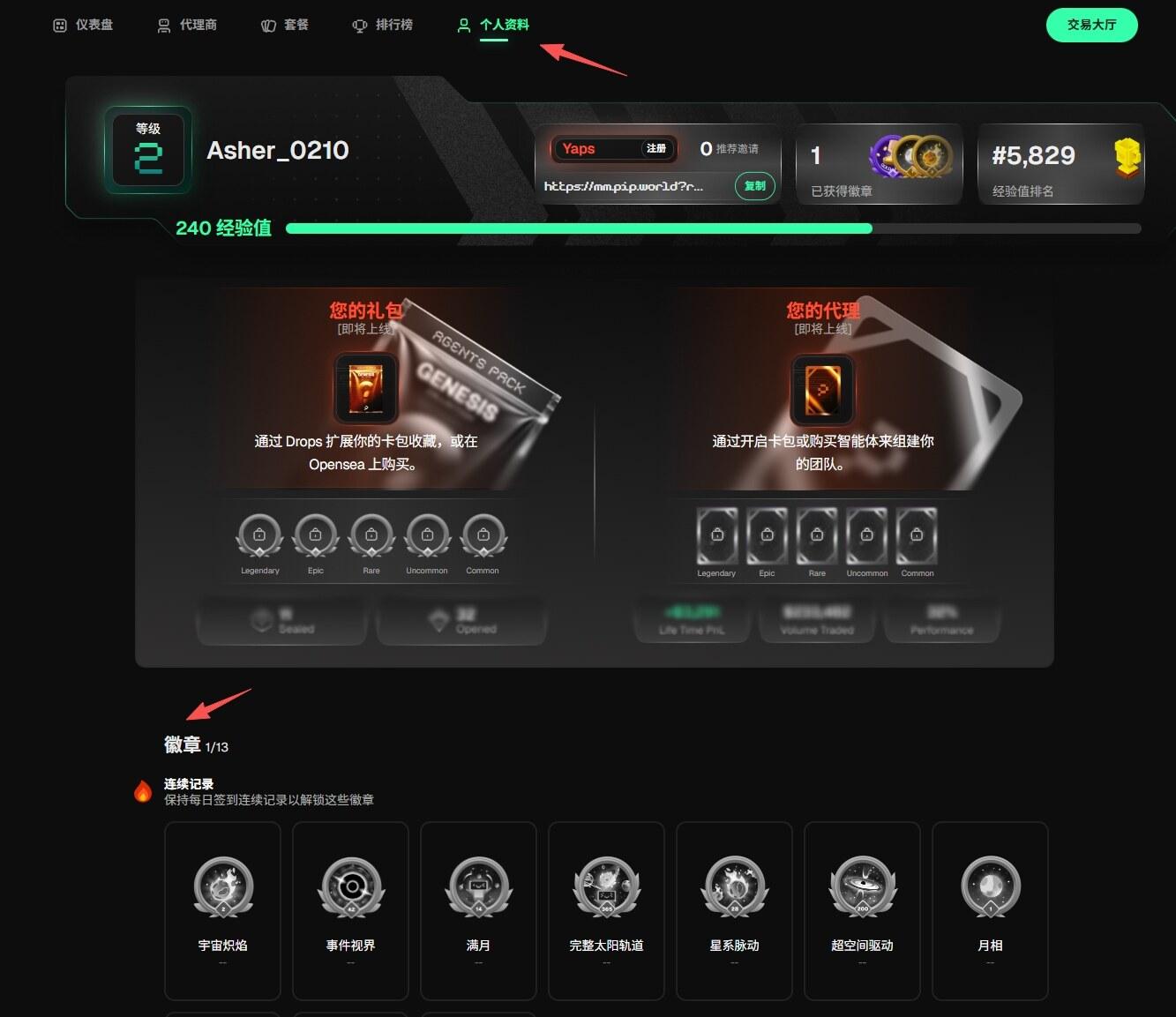 STEP 5. 点击“个人资料”,下拉页面可查看徽章解锁情况,内容包括连续签到、体验产品等任务。