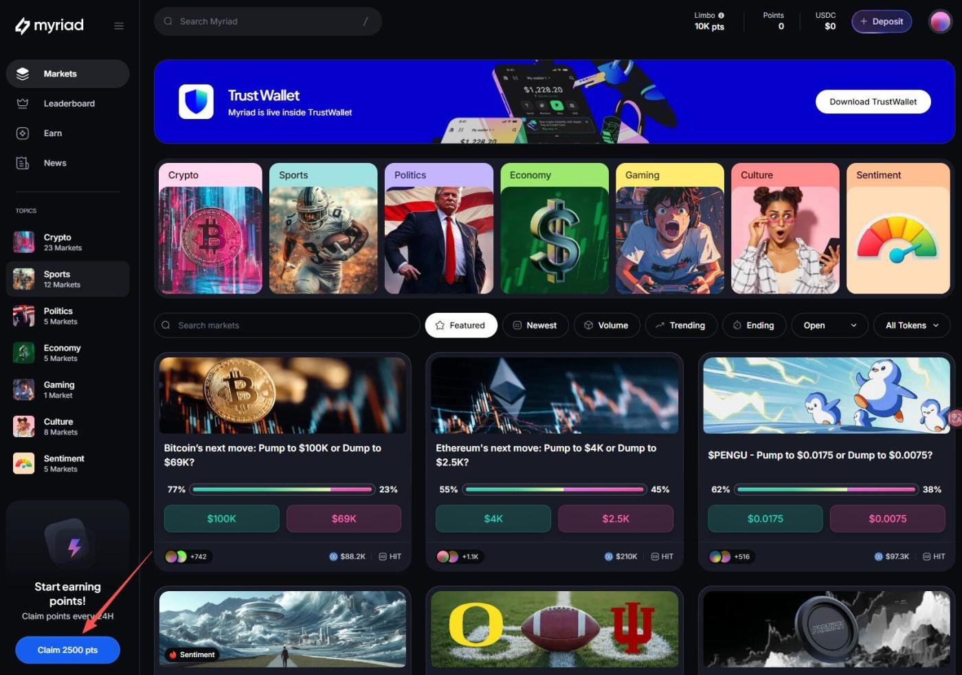 Myriad 是一个预测市场平台,允许用户直接从网站、社交媒体(如 X)和新闻平台上预测和交易真实世界事件的未来结果,例如加密货币价格走势、政治选举、经济指标、体育赛事、娱乐新闻和文化趋势。用户可以通过浏览器扩展或集成钱包无缝参与,平台支持 USDC 等稳定币交易,并使用积分系统奖励活跃用户。