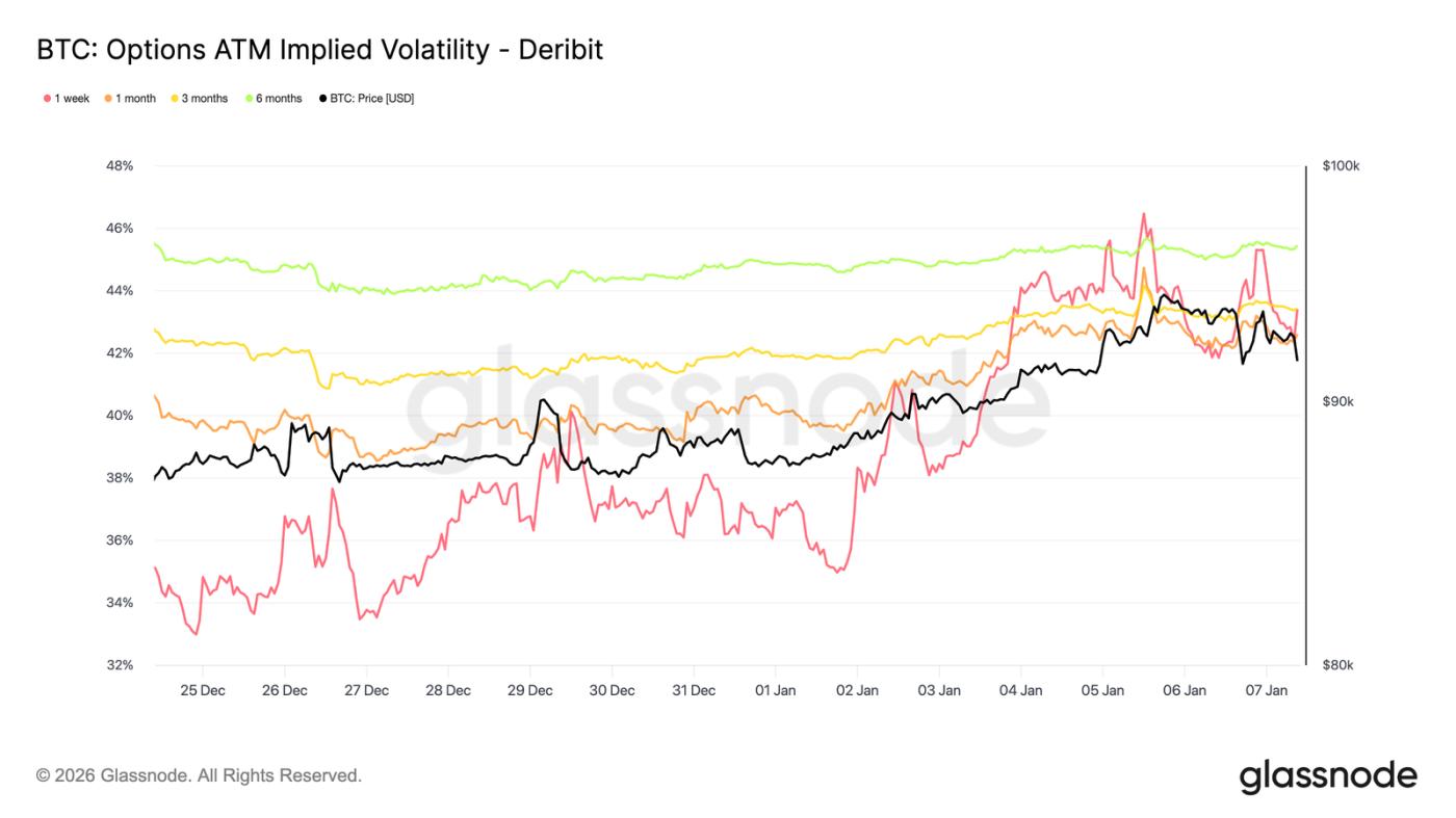 尽管有所回升,但隐含波动率仍处于压缩状态。从一周到六个月的各期限波动率集中在 42.6% 至 45.4% 之间,曲线形态相对平坦。