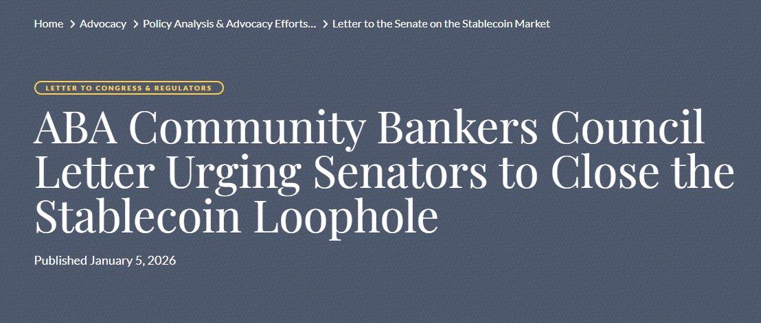 美国银行家协会(ABA)是呼吁全面禁止稳定币利息支付的最主要团体。该协会在 1 月 5 日发布的一封公开信中主张,《GENIUS 法案》中的利息支付禁令不应只适用于发行方,还应进行广义解读,并将适用范围扩展至关联方。他们正推动将这一解读明确写入《加密市场结构法案》。