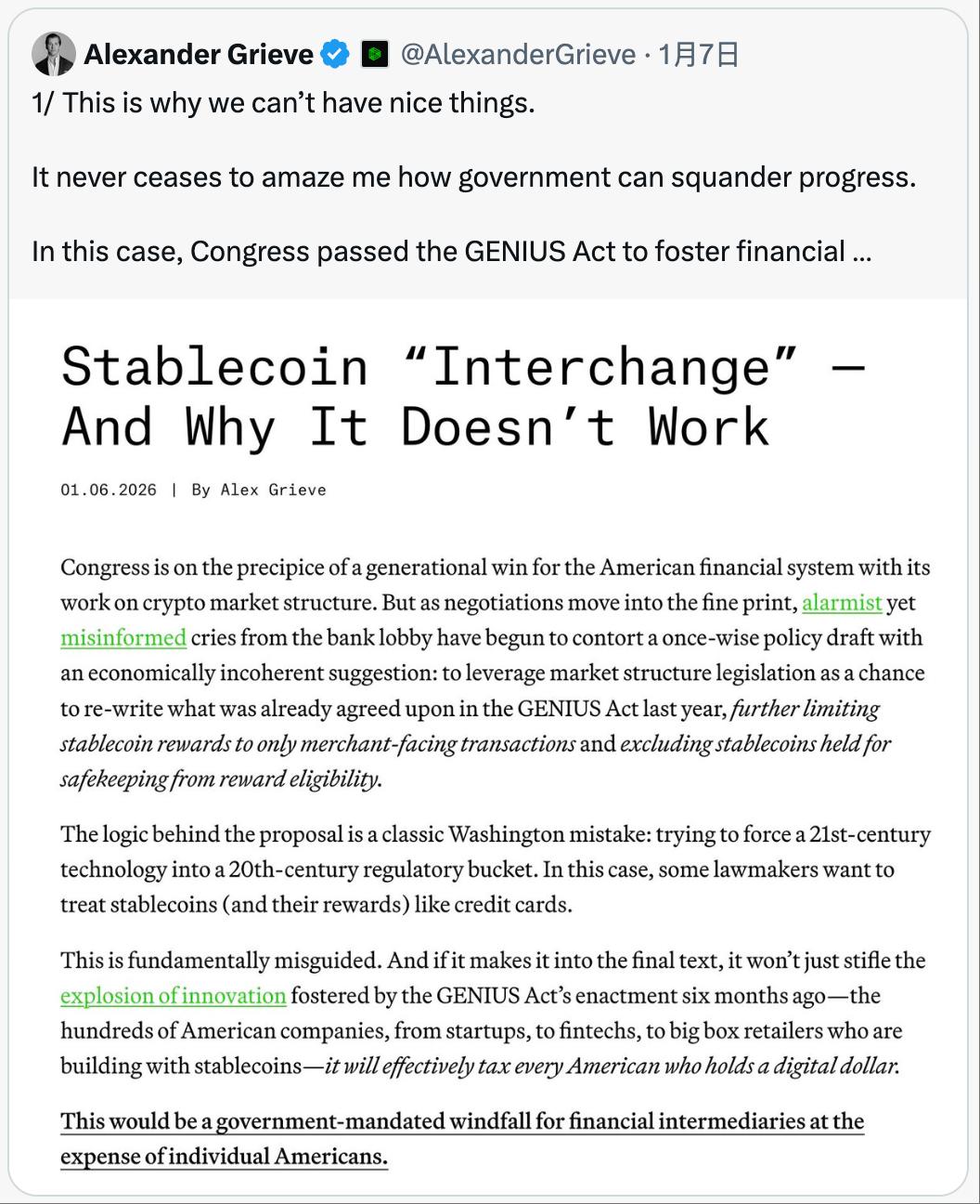 然而,在美国参议院相关委员会于 1 月 15 日审议《加密市场结构法案》(该法案旨在实现加密货币监管的系统化)之前,一场围绕「是否应将稳定币利息禁令延伸至分销环节」的争论已全面展开。