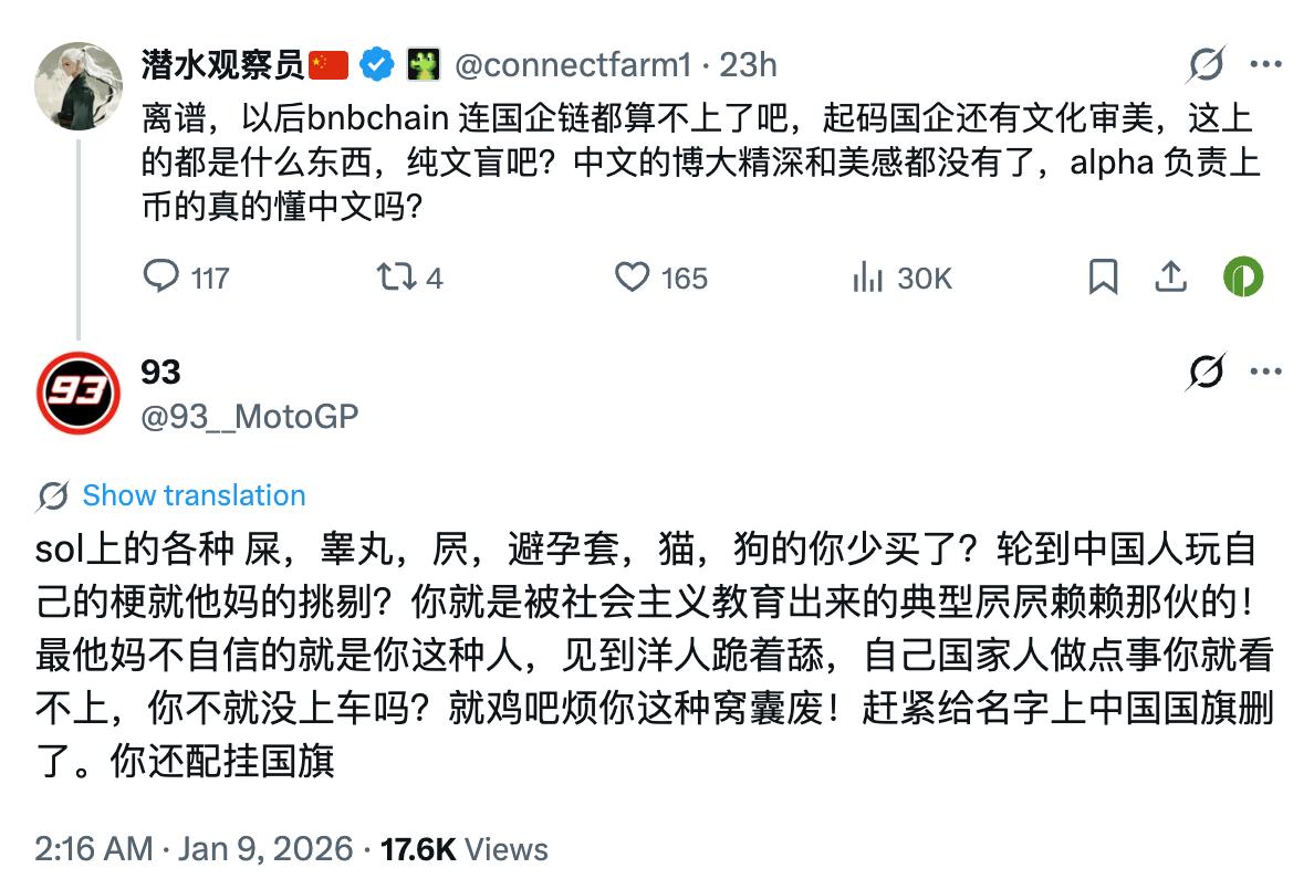 针对此事,加密 KOL 潜水观察员从探讨中文语言纯粹性的角度发文表示,「离谱,以后 BNB Chain 连国企链都算不上了吧,起码国企还有文化审美,这上的都是什么东西,纯文盲吧?中文的博大精深和美感都没有了,alpha 负责上币的真的懂中文吗?」