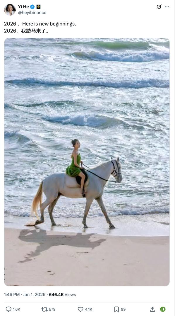 1 月 1 日,新年伊始,币安联席 CEO 兼联创何一发文庆祝自己开启新的一年,配文为「2026,新的开始;2026,我踏马来了。」配图为其本人在海边骑着一匹白马的照片,颇具万象更新的气度,评论区则是清一色的称赞和共同庆贺。