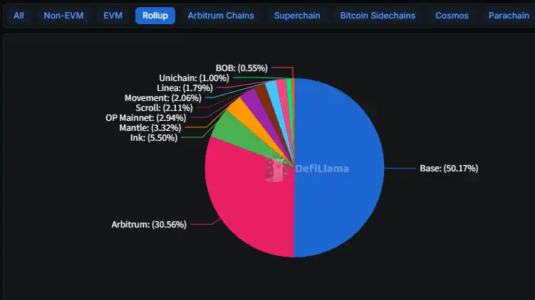 Coinbase 的这条 L2,从去年年初 31 亿美元 TVL 涨到 56 亿,占了整个 L2 赛道的 50%。Arbitrum 守住了 30% 但基本没增长。剩下几十条 L2,大部分在空投发完之后就没人用了。