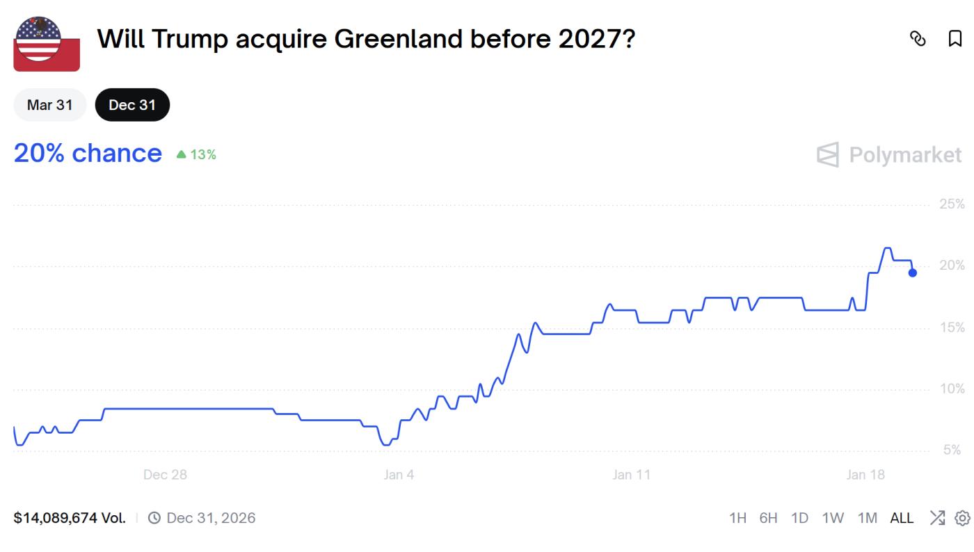 Polymarket 最新数据显示,市场押注特朗普在 2027 年之前获得格陵兰岛的概率为 20%。