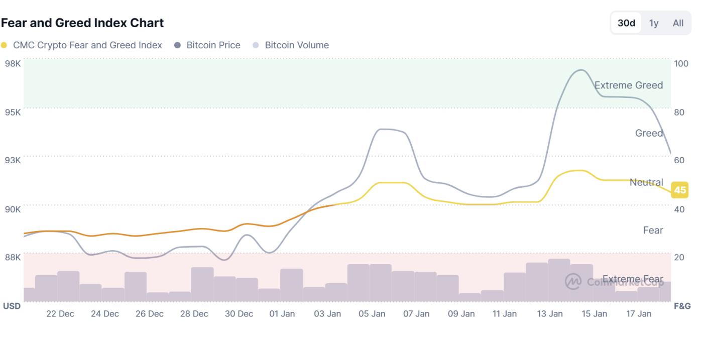 1 月 18 日晚间,加密交易指标分析平台 CoinKarma 发文表示,「BTC 本周一度涨至接近 98,000 美元,但当接近该价位时,市场出现了近期几周内最明显的抛压,导致价格小幅回落。不过,总体买卖双方的流动性尚未出现明显失衡,仍保持相对平衡。其他关键市场指标尚未出现明确信号。基于当前情况,年初相对低点入场的多头持仓者可考虑获利了结,可选择全部或部分平仓,并等待更清晰的信号后再重新入场。
