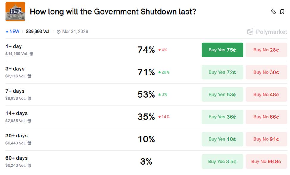 美国财政关闭时间持续时间延长的可能性。来源: Polymarket尽管风险很高,但预算停摆并非必然发生。美国国会仍可透过通过剩余的支出法案或次暂时延长预算来避免这种情况。