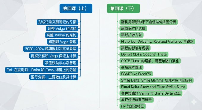 期权结构虽然长期Contango,但不是直接看IV”买近卖远”这么简单。 你如果想把日历套利做成稳定赚钱、净值更平滑的策略,还要从现实层面去考虑一件事:你每天付出的时间损耗(Theta)和成本,换回来的这些波动收益,到底划不划算? 这里有个很少人讲的坑:行情一旦走出你预期的区间,近端那部分的对冲效果就会大大减弱,结构也会悄悄变形,把主要的风险落在远端那条腿上。 于是就会陷入一个困境,看着像在套利,交易体验却像在扛单😅 第四课@JeffLia12309881 把讲义从50页增加到70多页,还多讲了一节。为什么要花时间讲这些? 因为期权的日历套利想做到“净值更平滑,可长期复现”,就必须清楚整体的盈亏到底来自哪里,以及跨期限的Vega如何管理? 明白人看配图里的大纲估计就知道,为什么要讲了。只有先把这件事讲透,才有条件去“改进结构”,像Jeff也在群里分享了自己如何改进日历套利Gamma“性价比”的思路,这类细节都是拉开收益的地方。 所以常说:早点加入,有人把原理梳理清楚了,自己交易起来就少走弯路、少交学费。 欢迎添加VX:Maxli1700 了解课程,共同进步