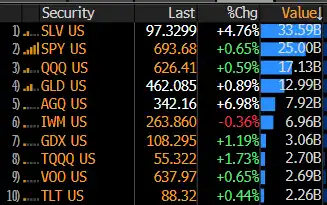 当日全球最大的白银 ETF iShares Silver Trust (SLV) 当日成交量高达 320 亿美元,是其日均成交量的 15 倍,甚至超过了标普 500 ETF(SPY)、辉达(NVDA)和特斯拉(TSLA)的总和,成为全球成交量最大的证券。