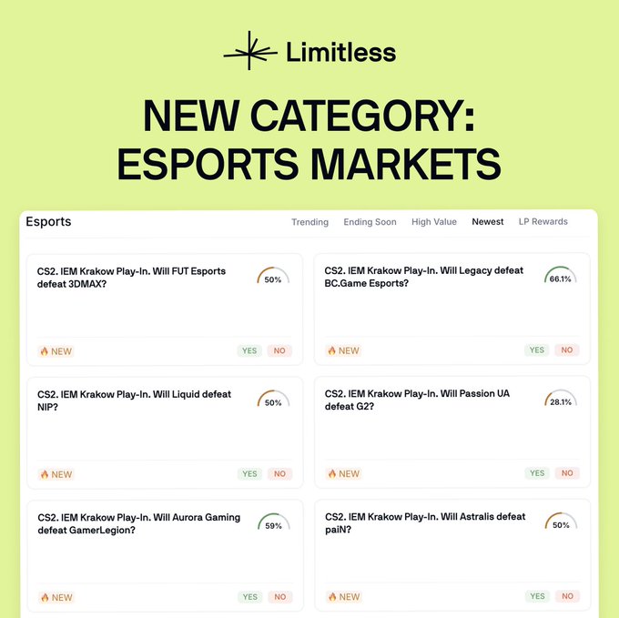 Limitless01-28本文为机器翻译展示原文重磅消息:我们刚刚上线了电竞市场。 您现在就可以投注 CS2 IEM 克拉科夫站比赛和 LoL LCK 2026 赛事,无需支付庄家优势,也没有任何投注限制。 点击此处交易 → limitless.is/esports来自推特免责声明:以上内容仅为作者观点,不代表Followin的任何立场,不构成与Followin相关的任何投资建议。喜欢收藏 评论分享相关推荐深潮TechFlowAI “中转站”月入百万?五问揭开 Token 套利真相USDC0%Tin Tức Bitcoin资料来源:伊朗:伊朗与美国的会谈可能在今晚或明天取得突破。RIA0%Tin Tức Bitcoin巨鲸卖出了 10,800 个姨太 ,然后以更高的价格买回了 7,448 个姨太 。ETH3.68%