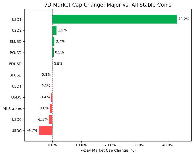上周,受币安(@binance)推出的4000万美元空投(2026年1月23日至2月20日)以及一项提供高达8%年利率的灵活储蓄产品奖励计划的推动,$USD1的市值飙升了43.2%。相比之下,$USDC的市值下跌了4.7%。