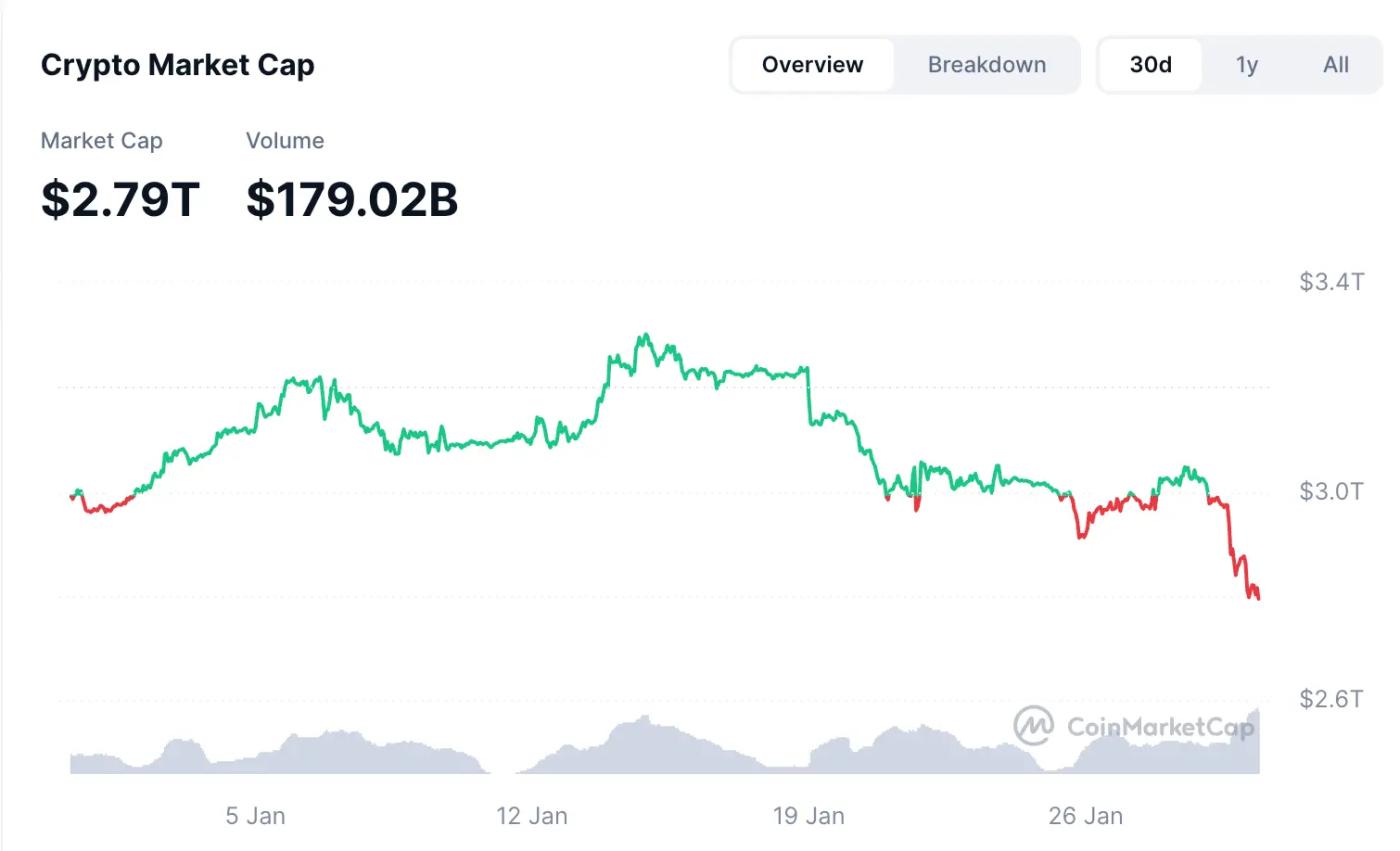在主流币种中,XRP 和 Solana 等热门代币同样经历了类似的单日跌幅。整体而言,加密货币市场总市值整体下跌约 5%,目前降至 2.79 兆美元。