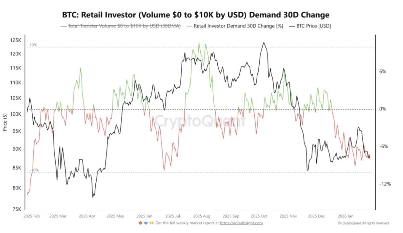 同时,零售投资者也在撤离。链上数据显示,0 至 10,000 美元的小额交易在过去一个月急剧萎缩,不只买入减缓,参与人数实质下降。而当 ETF 买盘消失、散户退场,市场只剩短线交易者和杠杆投机,波动性必然放大。
