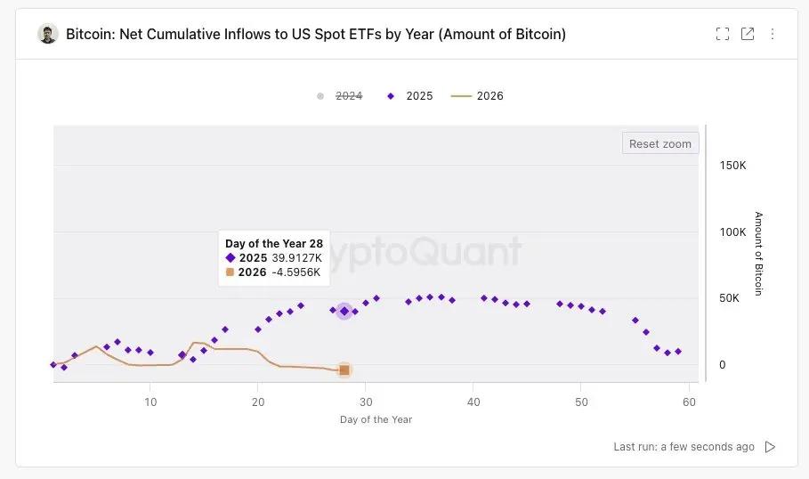 最后,加密市场结构本身的脆弱性应是下行行情中最重要归因。美国现货比特币 ETF 今年迄今净卖出约 4,600 枚比特币,去年同期则净流入近 40,000 枚。ETF 本来应该是本轮周期最稳定的买盘来源,如今这股支撑消失,反弹失去动能,下跌也因缺乏承接而更加剧烈。