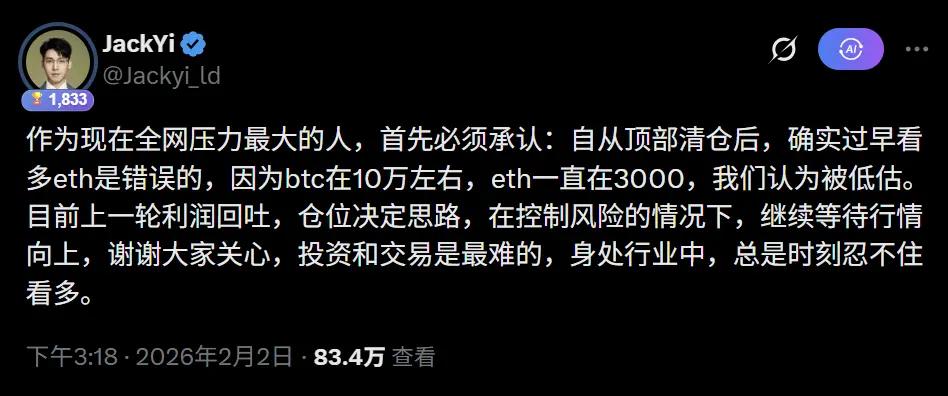 在最近几天易理华发推承认错误,“自从顶部清仓后,确实过早看多eth是错误的,因为btc在10万左右,eth一直在3000,我们认为被低估。目前上一轮利润回吐,仓位决定思路,在控制风险的情况下,继续等待行情向上,谢谢大家关心,投资和交易是最难的,身处行业中,总是时刻忍不住看多。”