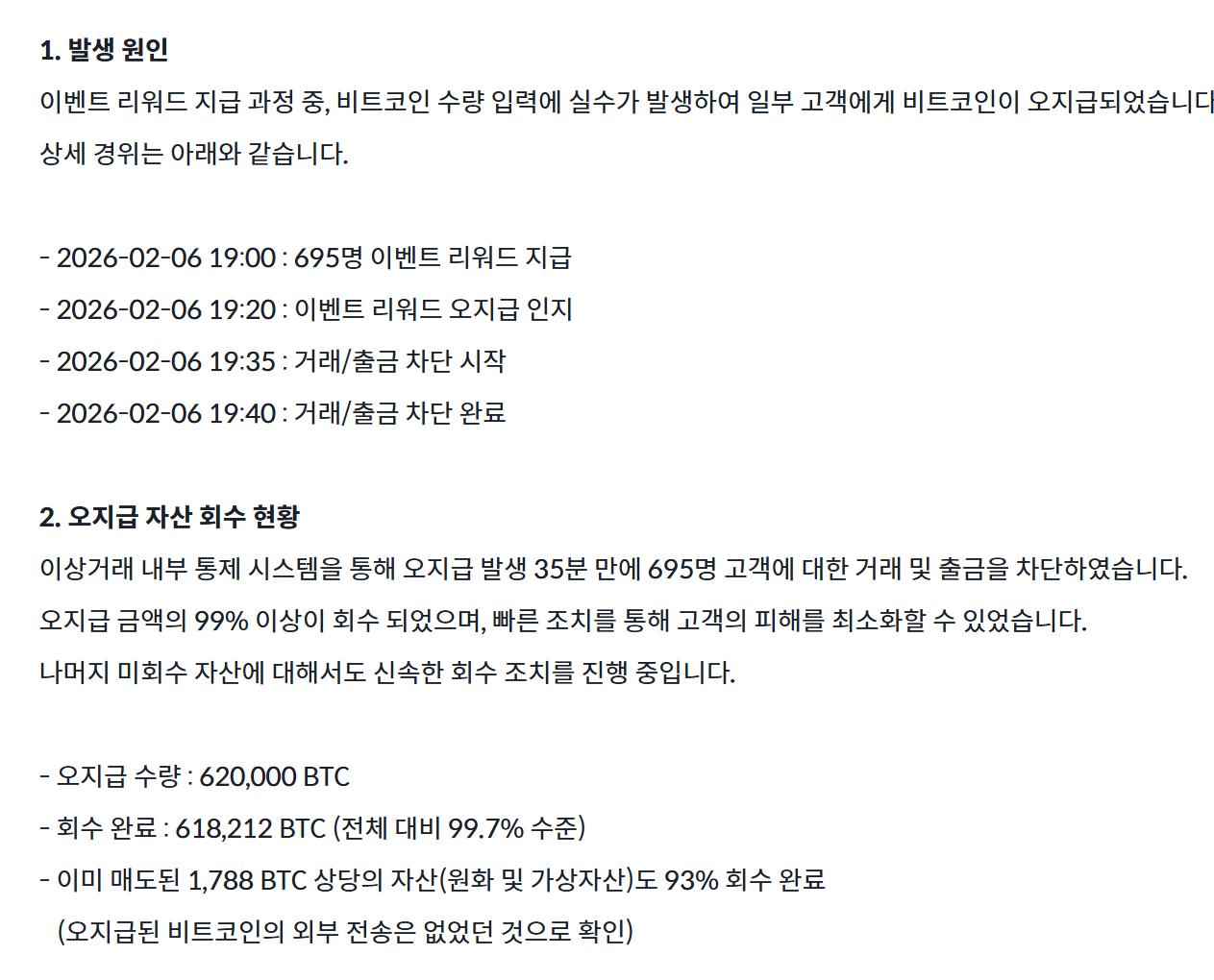 深潮 TechFlow 消息,2 月 7 日,据韩国加密货币交易所 Bithumb 公告披露,该交易所在活动奖励发放过程中出现操作失误,导致向 695 名用户错误发放了总计 62 万枚比特币(而非此前市场猜测的 2000 枚)。Bithumb 在发现问题后 35 分钟内迅速冻结了相关账户的交易和提现功能,截止其发稿已成功回收 618,212 枚比特币,占错误发放总量的 99.7%。已被售出的 1,788 枚比特币对应资产也已回收 93%。