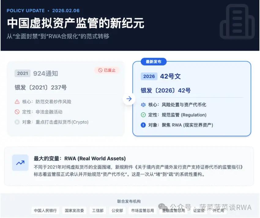 2021年的924通知通篇围绕虚拟货币,彼时"RWA"这个概念在国内监管语境中几乎不存在。但42号文用了大量篇幅专门界定和规范"现实世界资产代币化"(RWA),这本身就是一个巨大的信号——监管层正式承认了RWA作为一种业务形态的存在,并且决定为它划定游戏规则,而不是一刀切地否定。