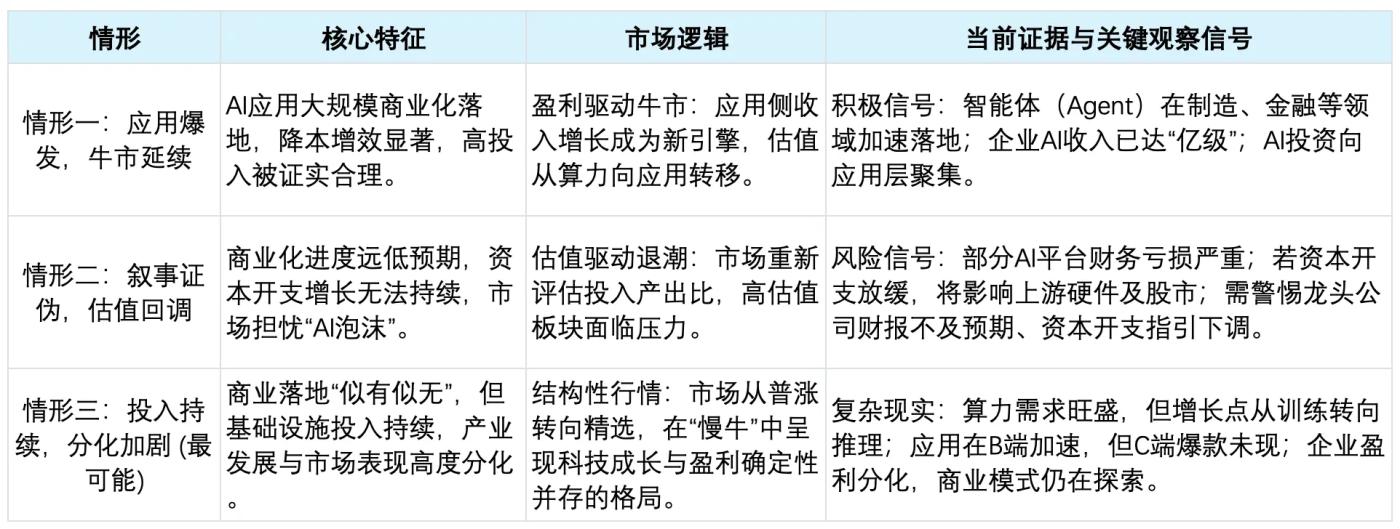 美国AI投资在2026年因技术竞赛、国家战略和经济增长需求,大概率会继续保持高增长,尤其是巨头的资本开支。然而,这已不再是单纯的“数量”增长,市场将更关注三种潜在情形的核心特征与对应的市场逻辑: