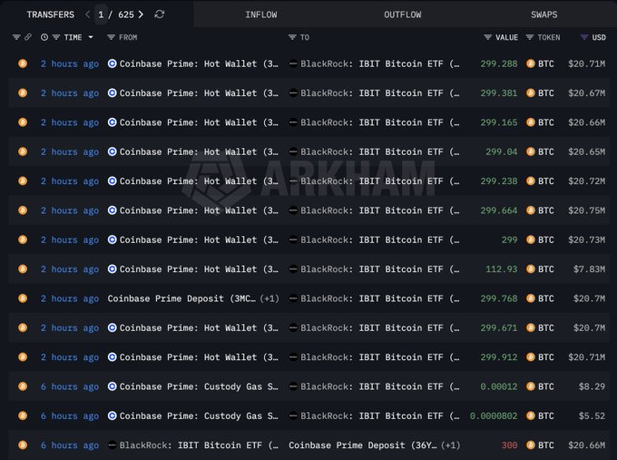 随后,BlackRock 从 Coinbase Prime 收到 3,107 美元BTC(2.1483 亿美元),净流入为 295 美元BTC(2040 万美元)。