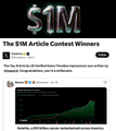 1/ The winner of the $1,000,000 X Article @beaverd is a serial rugger who made $600k from memecoin pump & dumps 🧵