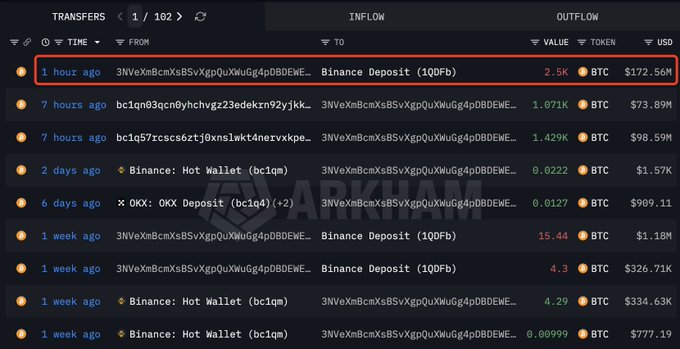 巨鲸3NVeXm 一小时前向 #币安 存入了 2,500 美元BTC(1.7256 亿美元)。 intel.arkm.com/explorer/addres...…