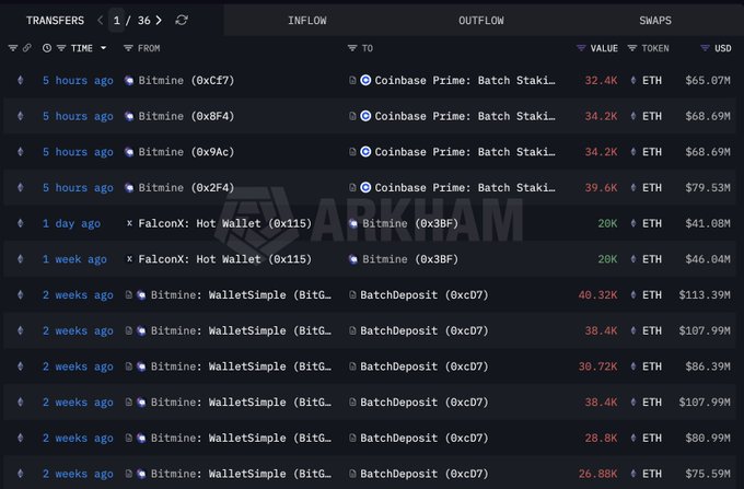 It seems that Tom Lee(@fundstrat)'s #Bitmine bought another 20,000 $ETH($42.3M) from BitGo 7 hours ago.