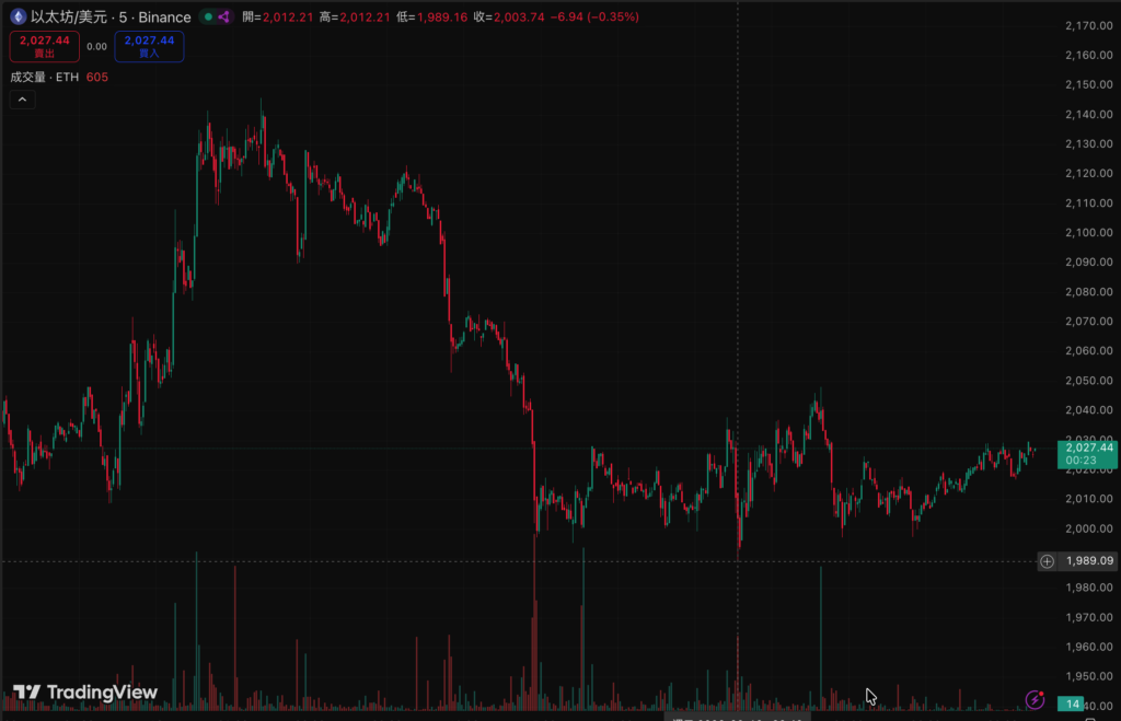 以太坊则是在昨日下午三点大跌后,又在昨晚跌破2000美元大关,最高在今早涨到2048美元无法突破,暂报2026美元。相较于比特币的纯粹横盘,昨日以太坊大跌与到2000美元区间的测试,都呈现出一个上行阻力巨大,无法突破的状态。